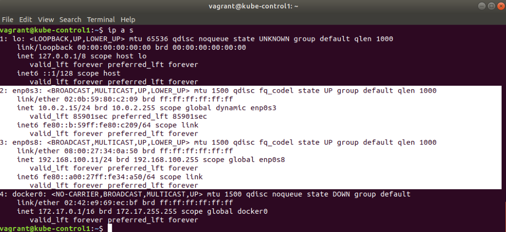 kube-control1이 control plane이기 때문에 먼저 설치를 한다. enp0s8에 보면 ip 주소는 192.168.100.11이다.