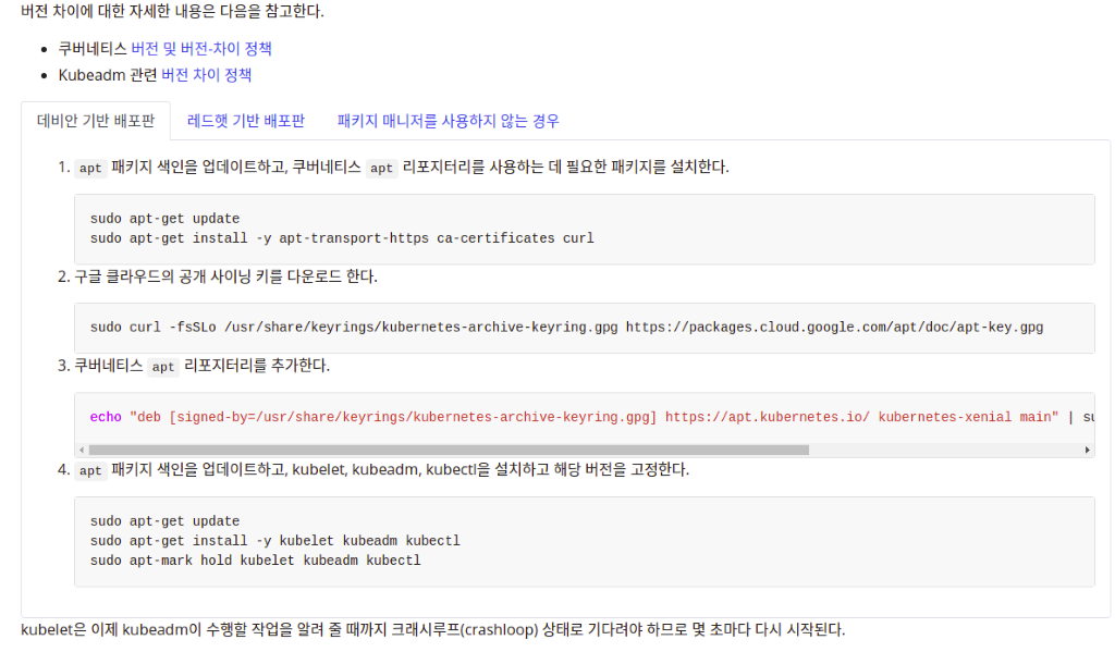 쿠버네티스 공식 홈페이지에 보면 자세한 설명이 나와있는데, 리눅스 계열 별 설치방법이 각각 따로 존재한다. 호스트가 현재 Ubuntu이기 때문에 데비안 기반 배포판 내용을 참고하여 진행하였다.