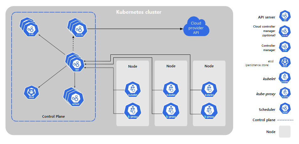 쿠버네티스의 기본 중에서 쿠버네티스 아키텍처에 대한 간단한 설명과 함께 다양한 테스트를 해보려고 한다. 쿠버네티스 클러스터의 구성 요소는 큼직하게 컨트롤 플레인(Control Plane), 노드(Node), 애드온(Addons)이 있다.