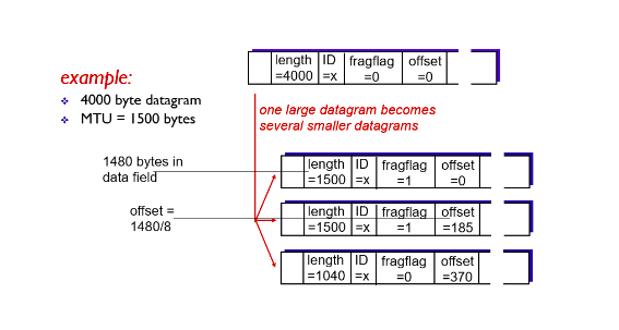 MTU가 1500이면 IP header 20byte를 기본적으로 가져가기 때문에 실제 사용할 수 있는 데이터는 1480byte가 됩니다. 그래서 4000byte인 데이터그램이 있다고 한다면 IP header 20byte를 쓰기 때문에 실제 사용할 수 있는 데이터그램은 3980byte가 됩니다.